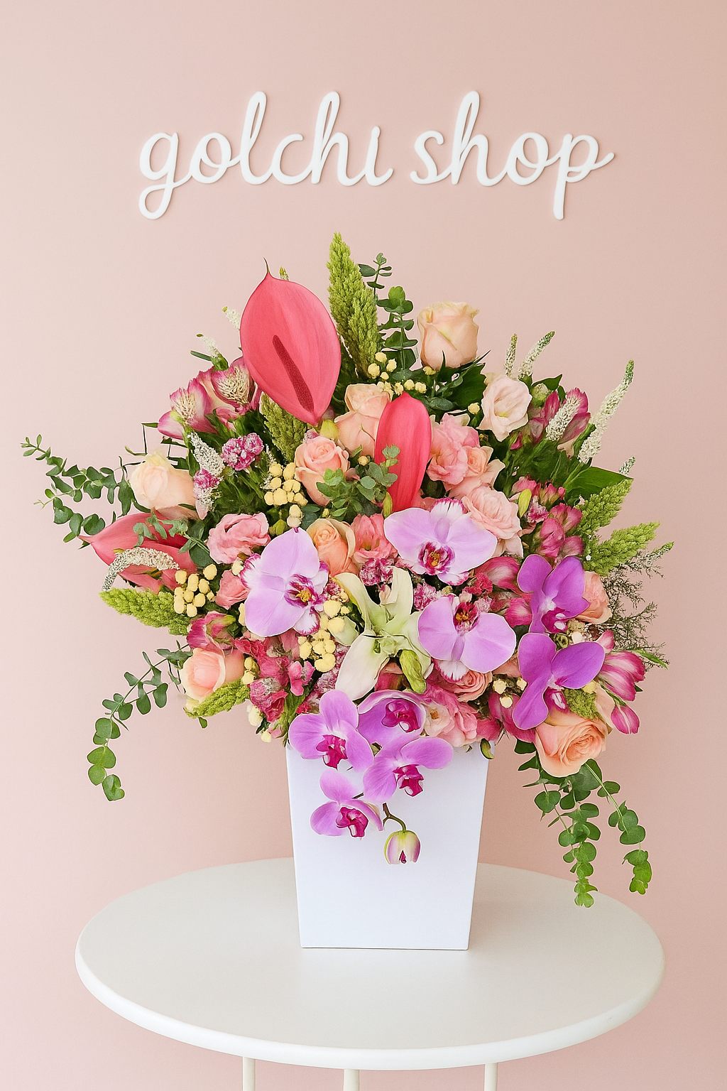 باکس گل لاکچری با ترکیبی خیره‌کننده از ارکیده‌های صورتی، آنتوریوم‌های قرمز و رزهای هلویی 🌸❤️؛ انتخابی شیک و متفاوت برای خاص‌ترین لحظات زندگی.