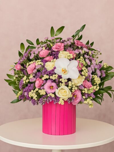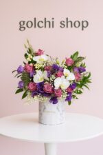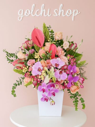 این باکس گل با طراحی فوق‌العاده در جعبه مرمری و ترکیب رنگی خیره‌کننده رزهای صورتی و بنفش، ارکیده‌های سفید و شکوفه‌های ظریف ساخته شده است. نتیجه این ترکیب، هدیه‌ای است که هم از نظر بصری باشکوه است و هم از نظر معنایی سرشار از پیام‌های عاشقانه.