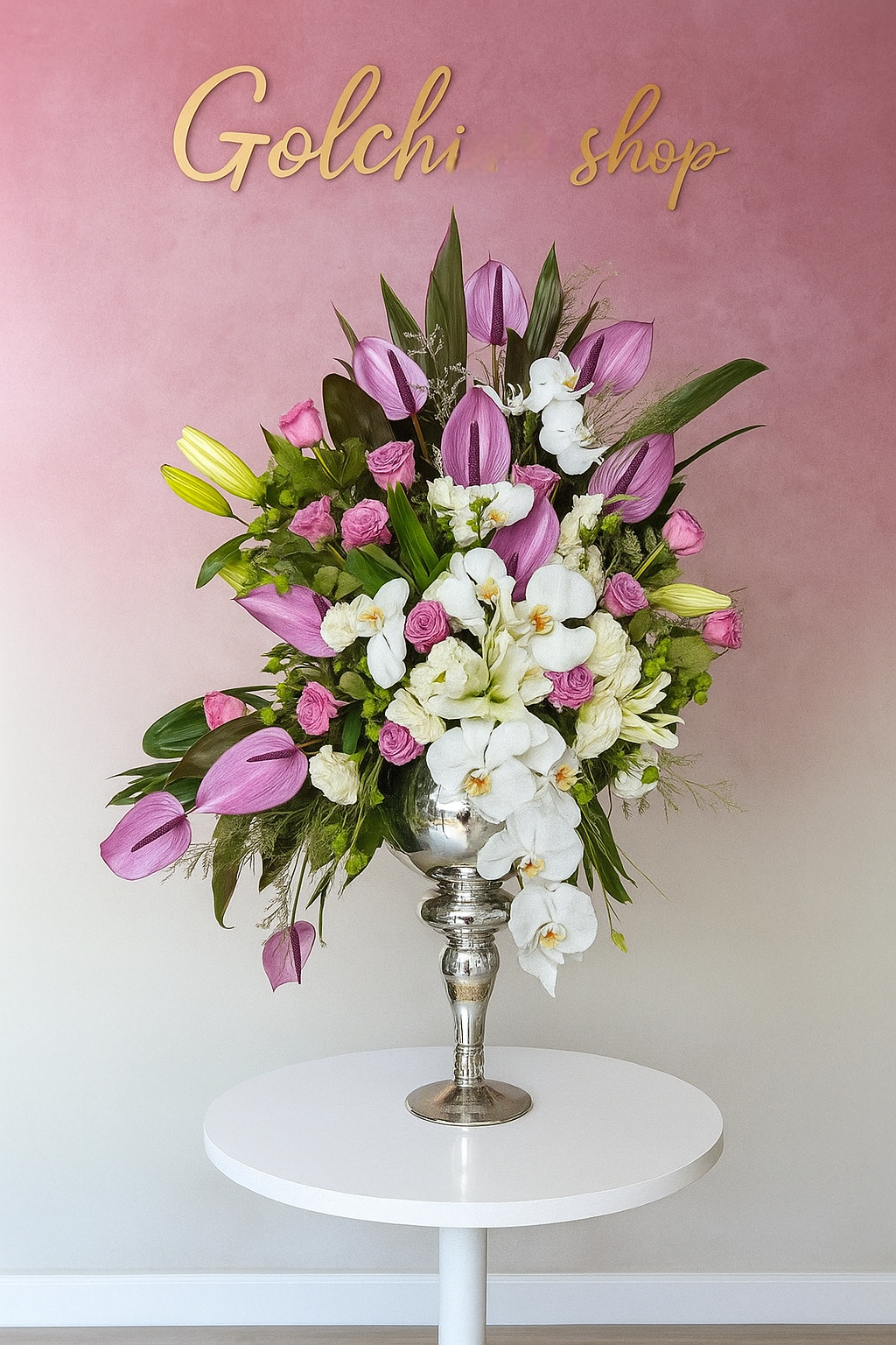 این باکس گل شیک و چشمگیر با ترکیبی از آنتوریوم‌های بنفش خاص، رزهای صورتی رمانتیک، ارکیده‌های سفید سلطنتی و لیلیوم‌های معطر طراحی شده تا بهترین همراه برای یکی از ماندگارترین لحظات زندگی شما باشد 🌿🌹.