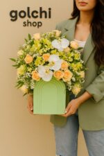 مشخصات این باکس گل خواستگاری : باکس مستطیلی و زیبا و ترکیبی از گل های سفید و زرد زیبا