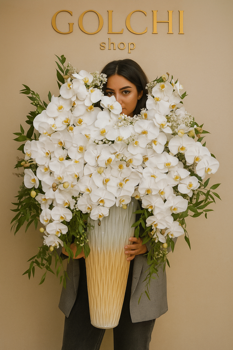 مشخصات باکس گل خواستگاری : باکس مخروطی بر عکس و زیبا و ترکیبی از گیاه های سبز و گل های سفید زیبا