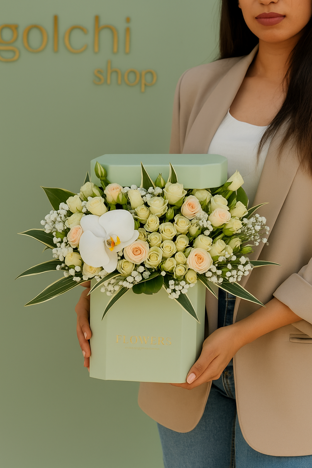 مشخصات باکس گل خواستگاری : باکسی کوچک و زیبا و ترکیبی از گل های زرد و سفید