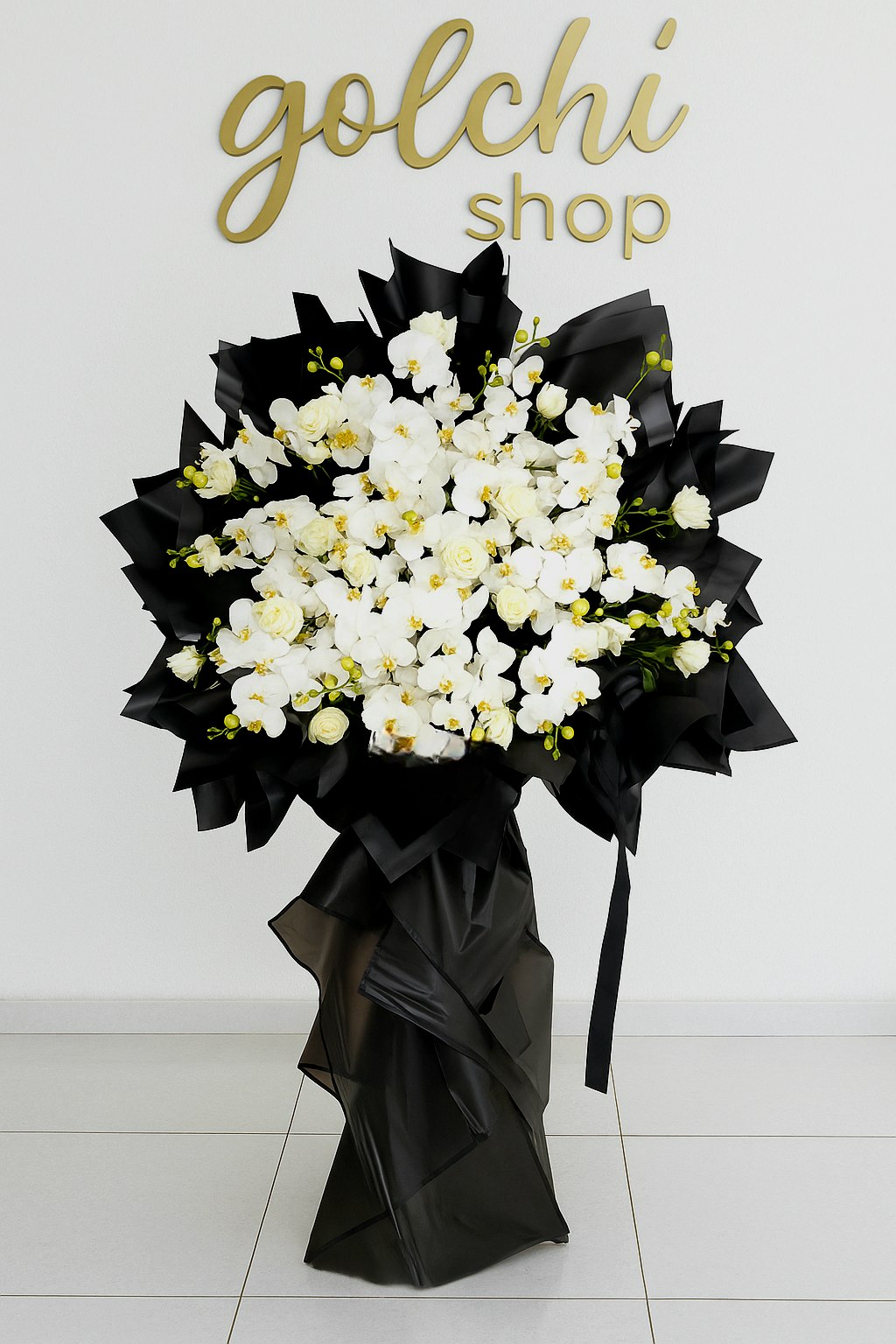 مشخصات این باکس گل خواستگاری : دسته گلی زیبا و پیچیده شده در ربان های زیبا و مشکی و ترکیبی از گل های سفید و زرد