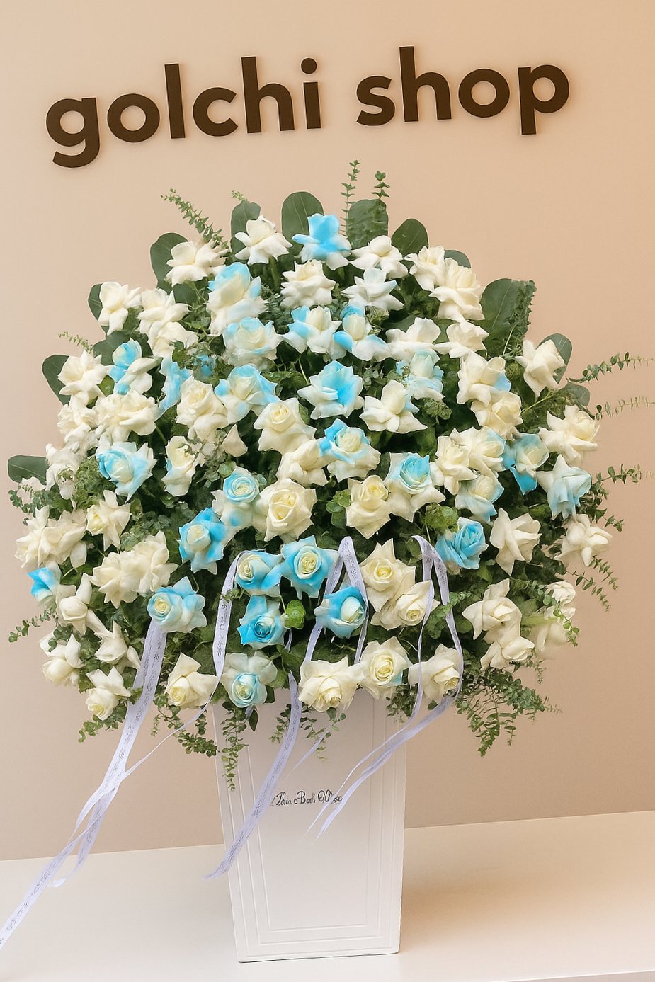مشخصات این باکس گل خواستگاری : باکسی زیبا و باریک و ترکیبی از گل های زرد و آبی آسمانی