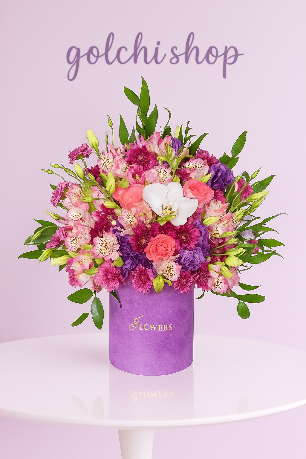 این باکس گل خاص با طراحی شیک در جعبه بنفش مخملی، ترکیبی از رز قرمز، گل‌های صورتی و بنفش، ارکیده سفید و شکوفه‌های تزئینی است که هارمونی رنگی بی‌نظیری را به نمایش می‌گذارد.